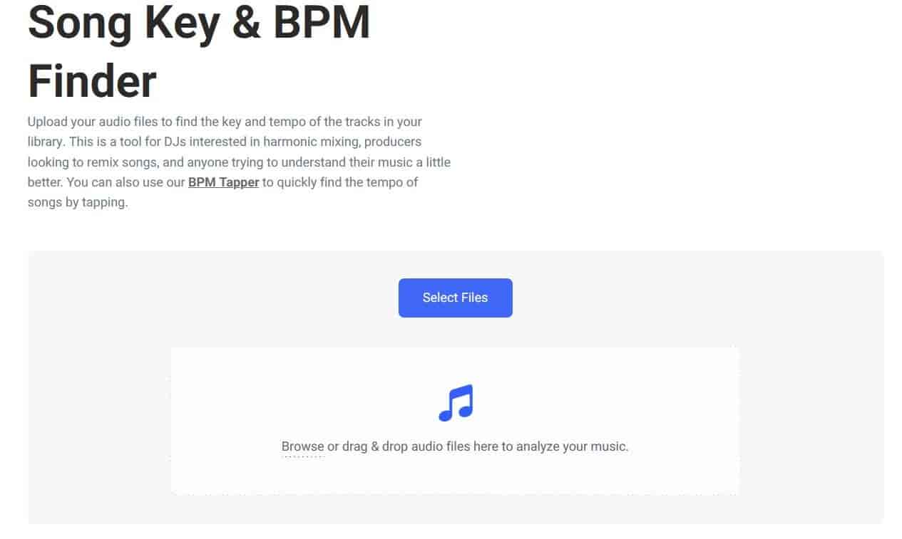 Just like Vocal Remover, Tunebat has multiple functions on the one platform, such as a Metronome and even Song Mastering. To use the find key and BPM values tool, upload your audio file and let the software automatically analyze the song for you. The results will then be displayed to you in a table. It also has a tap tempo tool if you wish to use that instead.