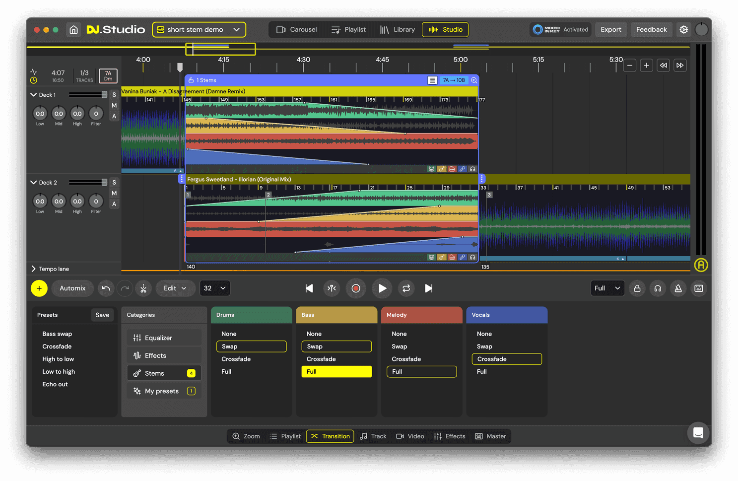 DJ.Studio offers advanced stem separation technology, allowing you to isolate specific elements of a track, such as vocals, drums, or basslines. This feature provides an extra level of creative freedom for DJs, as you can remix tracks on the fly or make custom edits that would otherwise require specialized software. Stem separation makes it easy to build unique transitions by controlling individual track components, enhancing your mix.