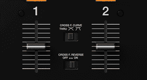 With the crossfader in the center, both channels play at equal volume. Sliding it in one direction turns down the volume of one track while increasing the volume of the other. When put fully to one side, you will only hear the chosen channel, the other will be silent.