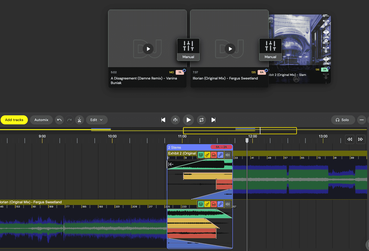 Start mashing - Now you can jump over to the editor timeline to start making the mashup. DJ.Studio has a bunch of tools that are super useful for making mashups: