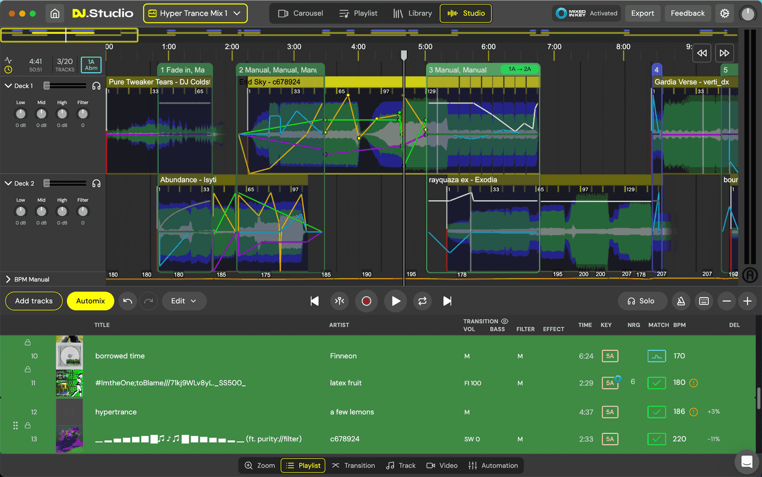(Optional) use the automix - This provides a suggestion for the order of songs, based on their harmonic content and speed and key and tempo matches your songs on the timeline.